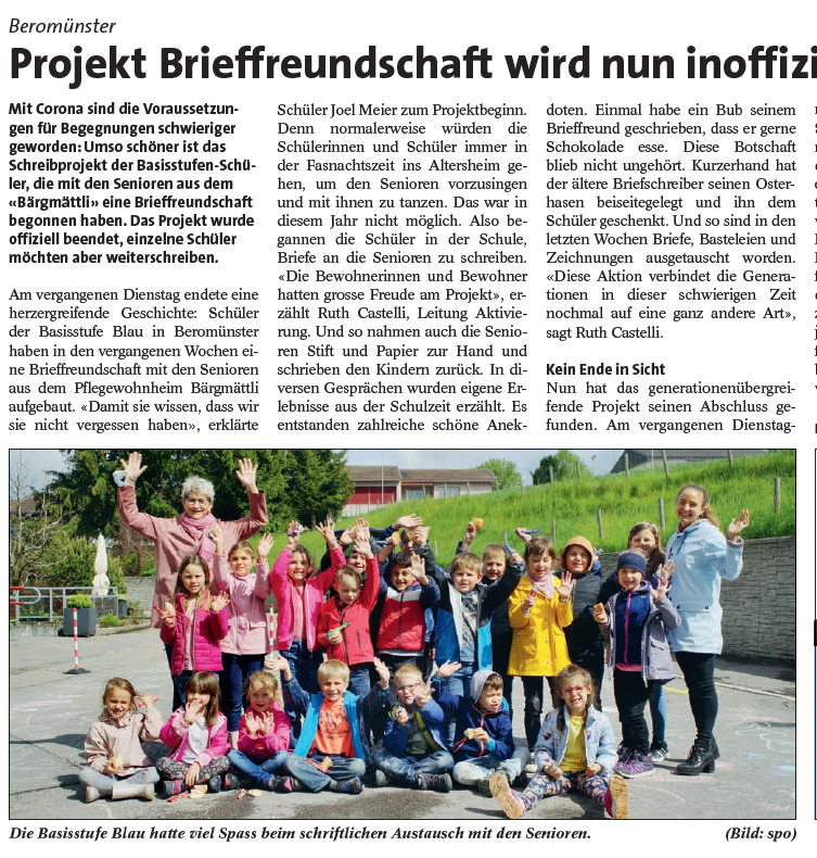Mit Corona sind die Voraussetzungen für Begegnungen schwieriger geworden: Umso schöner ist das Schreibprojekt der Basisstufen-Schüler, die mit den Senioren aus dem «Bärgmättli» eine Brieffreundschaft begonnen haben. Das Projekt wurde offiziell beendet, einzelne Schüler möchten aber weiterschreiben.